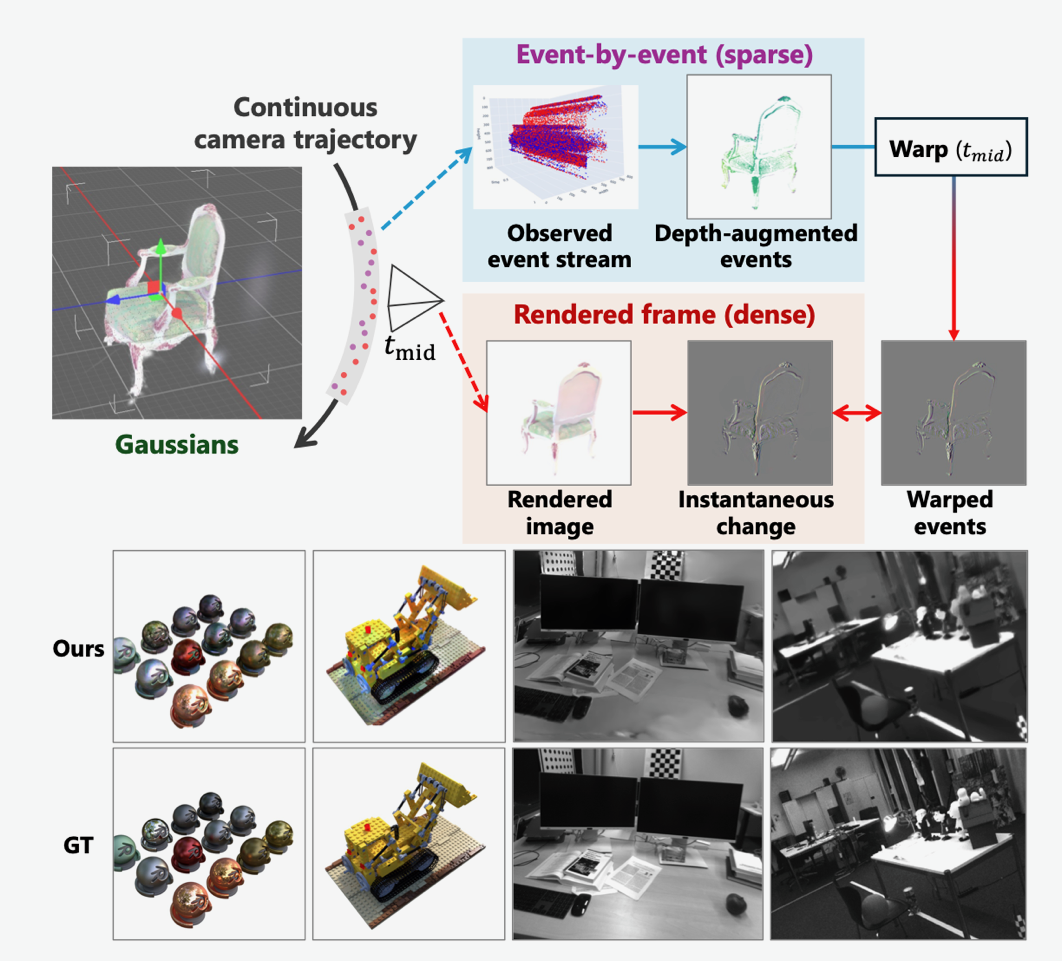 イベントカメラの「空間的に疎・時間的に密」というデータ特性を最大限活かしつつ、3D Gaussian Splatting (3DGS) による高品質な3次元再構成を実現する初の枠組み GPERT を提案します。本手法は、レイトレーシングを用いた イベント単位の幾何(深度)レンダリング と スナップショット単位の輝度レンダリング を分離し、Warped Events 画像を介して両者を統合することで、従来のイベントベース3DGS手法が抱えていた精度と時間分解能のトレードオフを解消します。事前学習モデルやCOLMAPによる初期化に一切依存せず、実世界データセットで最先端性能、最速クラスの学習時間、シーンエッジのシャープな復元を達成しました。